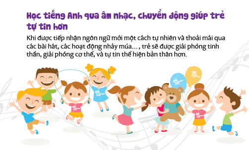 Đối với độ tuổi phát triển tốt nhất từ 4- 6 tuổi giúp bé hoàn thiện mình hơn thông qua mô hình được học tiếng Anh qua âm nhạc, chuyển động cơ thể giúp bé không chỉ tích lũy tiếng Anh mà còn mang lại niềm vui, sự dẻo dai cho cơ thể, tiếp cận với nghệ thuật âm nhạc và hứng thú học tập.